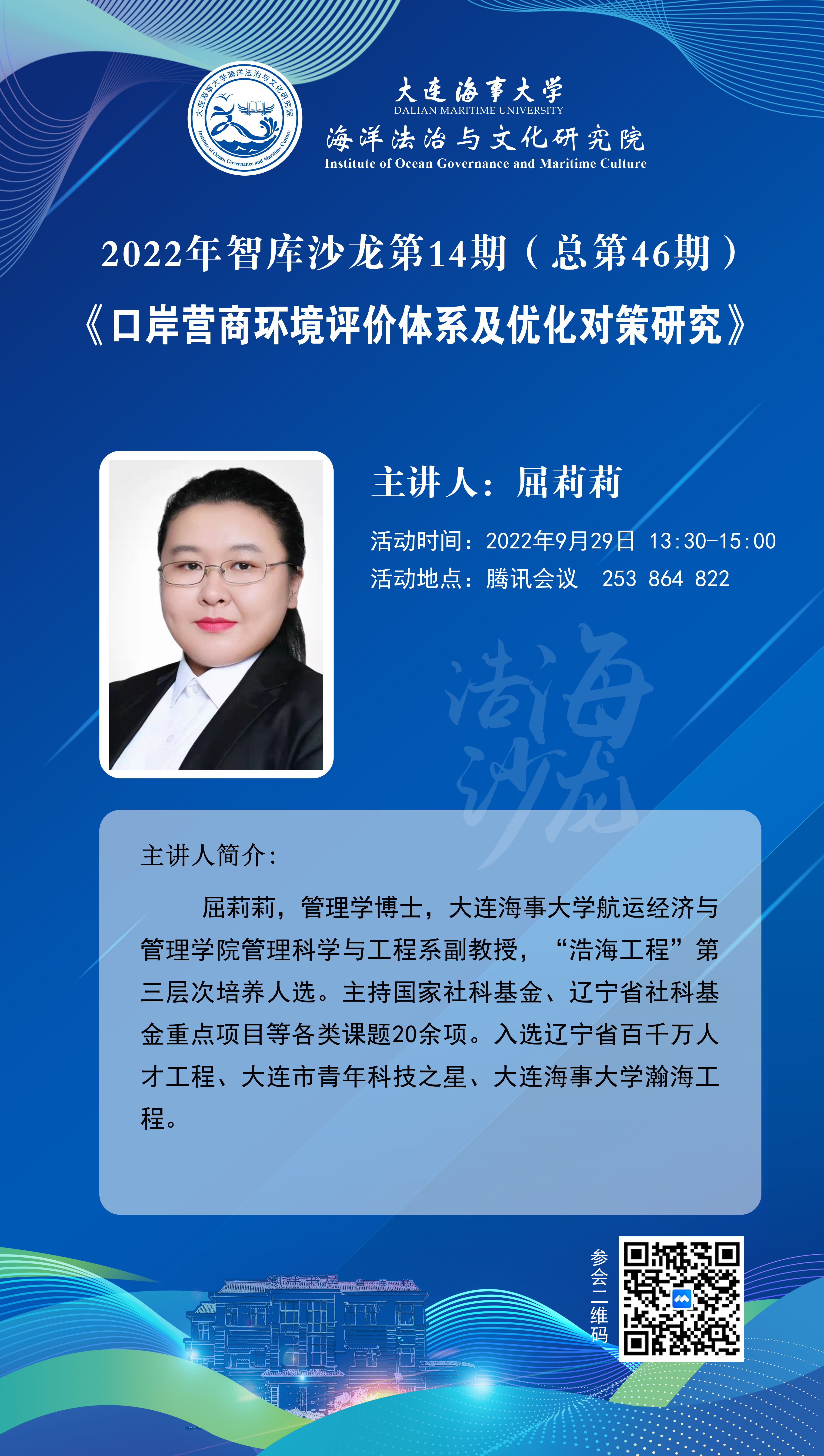 屈莉莉,管理学博士,Beat365唯一官方网站航运经济与管理学院管理科学与工程系副教授,“浩海工程”第三层次培养人选。主持国家社科基金、辽宁省社科基金重点项目等各类课题20余项。入选辽宁省百千万人才工程、大连市青年科技之星、Beat365唯一官方网站瀚海工程。