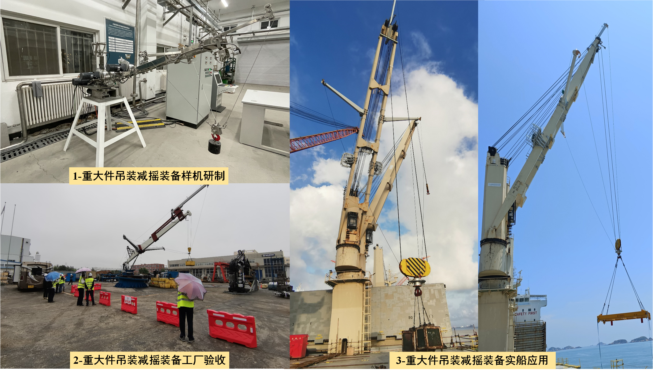 “高海况下重大件吊装减摇关键技术与核心装备”成果针对船舶非线性激励下的并联柔索冗余驱动、柔索固有弹性导致的高频振动、船舶非线性激励下吊重运动轨迹难以预测和载荷时变的瓶颈技术难题,发明了一种柔索并联机构主被动柔顺技术,同时研发了融合吊重轨迹预测和载荷动态估计的测控系统,研制的高海况下重大件吊装减摇核心装备在中远海运集团及交通运输部东海航海保障中心等多家单位进行实际应用。该成果共获得自主知识产权64项,包括国家发明专利12项、实用新型专利52项,发表高水平论文54篇,获得大连市技术发明奖一等奖1项。相关成果可在四级海况下完成海上重大件的吊装转运定位作业,提高了海上吊装作业的安全性和效率,打破了欧美公司对高端减摇装备的技术垄断,提升了我国的海洋建设与深远海补给保障能力。