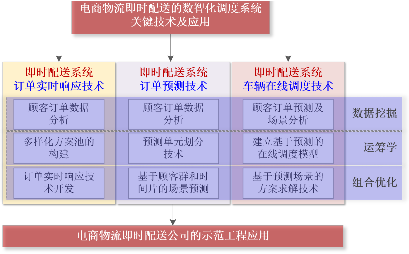 “电商物流即时配送的数智化调度系统关键技术及应用”成果面向我国电商物流发展重大需求,攻克了电商物流即时配送的订单实时响应、顾客订单预测、车辆在线调度等重大难题,形成了体系化的即时配送技术成果,有效提高了即时配送运力调度的科学性、有效性及智能性,在面向国家需求、突破技术瓶颈、打造自主可控技术体系等方面提供了理论支撑。所实现的电商物流即时配送的数智化调度系统已成功应用于若干同城物流即时配送公司的运营管理中,取得了显著的经济效益。
