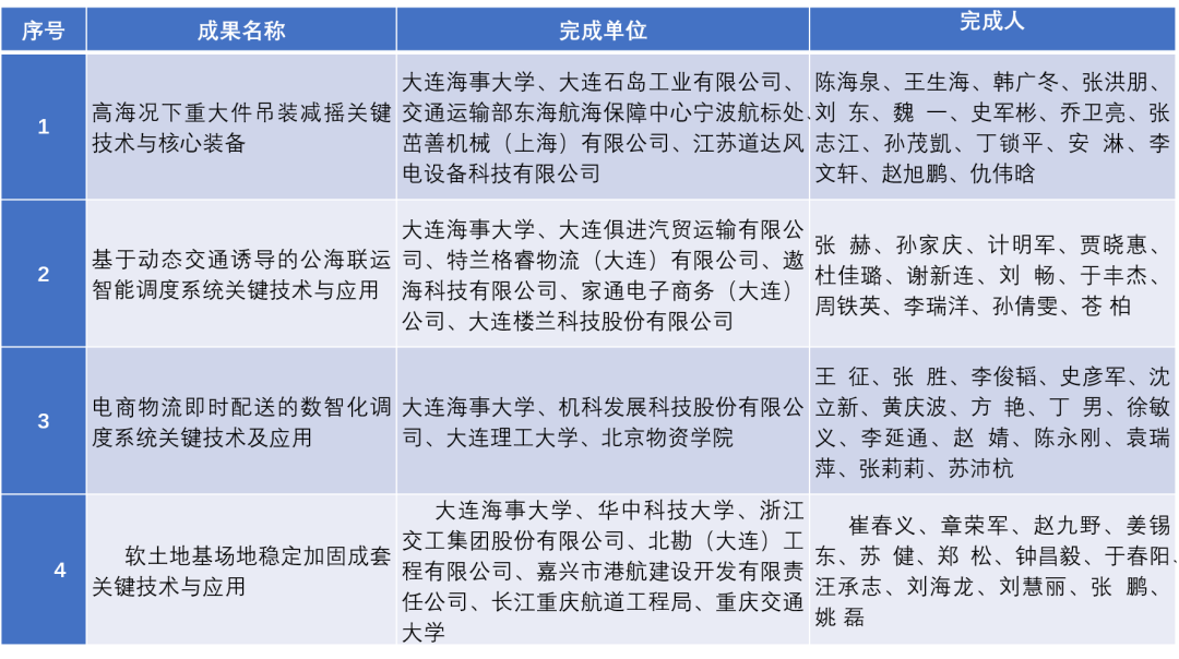 “基于动态交通诱导的公海联运智能调度系统关键技术与应用”成果是“一带一路”倡议和交通强国战略背景下,应用大数据、区块链、互联网+以及智能交通系统等关键技术,研发和应用基于实时动态交通流信息、船舶/车辆实时动态诱导的公海联运智能调度系统,有效填补了我国在公海联运智能调度相关研究领域的空白,部分研究成果具有国际先进水平。该成果制定行业标准1项,授权发明专利10项,登记软件著作权20项,出版专著4部、教材4部,先后获得中国物华图书奖、辽宁省自然学术成果奖等奖项。