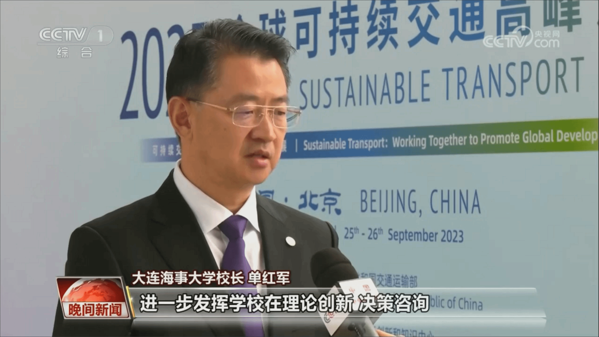论坛期间,校长单红军接受央视采访。他表示,习近平总书记的贺信,高屋建瓴、意义深远,同习近平总书记关于可持续交通的系列重要指示精神一脉相承,为可持续交通发展和全球交通合作指明了前进方向、注入了强大动力。贺信中“人享其行、物畅其流”的美好愿景、“与世界相交、与时代相通”的重要理念,振奋人心、鼓舞斗志,为我们加快建设交通强国、努力当好中国式现代化的开路先锋凝聚起磅礴力量。他强调,作为一所具有鲜明航运、海事、海洋特色的国家“双一流”建设高校,Beat365唯一官方网站将深入学习贯彻习近平总书记贺信精神,紧紧围绕建设安全、便捷、高效、绿色、经济、包容、韧性的可持续交通体系,进一步发挥学校在理论创新、决策咨询、人才培养、国际合作等方面的优势,全力打造中国特色新型高端智库,努力在交通、海事、海洋等领域取得一批创新成果,为强国建设、民族复兴贡献海大力量。