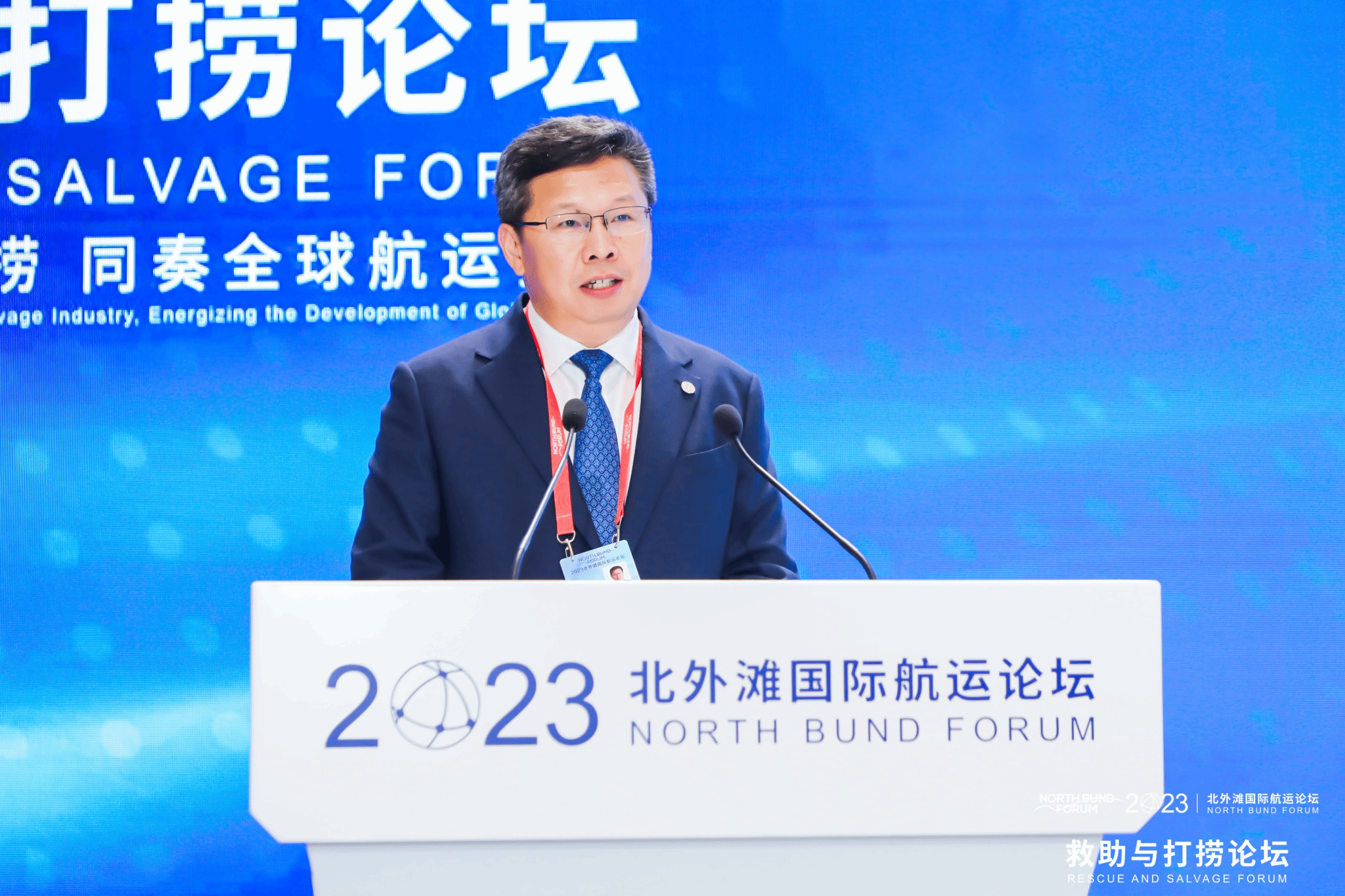 9月23日,2023北外滩国际航运论坛“救助与打捞”论坛在上海北外滩世界会客厅举行。本次论坛由上海市人民政府和交通运输部联合主办,交通运输部救助打捞局承办,交通运输部东海救助局支持。来自海上救助、港口航运、装备制造、船舶检验、航空工业等行业的政府管理部门、科研院所、行业协会相关单位约200名嘉宾代表,围绕“共建开放创新救捞,同奏全球航运强音”主题展开深入交流,共商平安、智慧、高效救捞发展之计。党委书记许民强应邀出席论坛并作题为《创新救捞科技发展、培养一流行业人才》的主旨演讲。