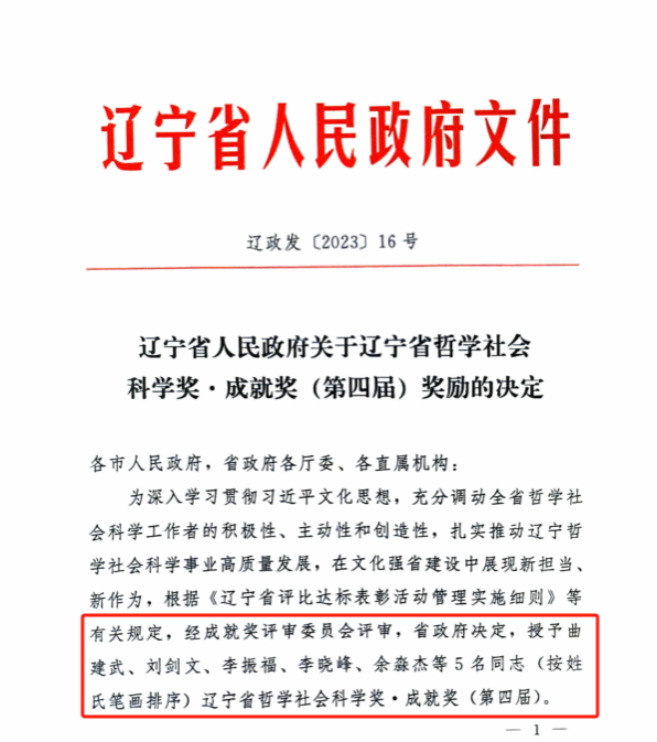 近日,经辽宁省人民政府决定,辽宁省哲学社会科学奖・成就奖(第四届)获奖入选者名单正式揭晓。全省共五位社科专家获得奖励,Beat365曲建武教授、李振福教授荣列其中,这也是Beat365首次获得此荣誉,实现了零的突破。