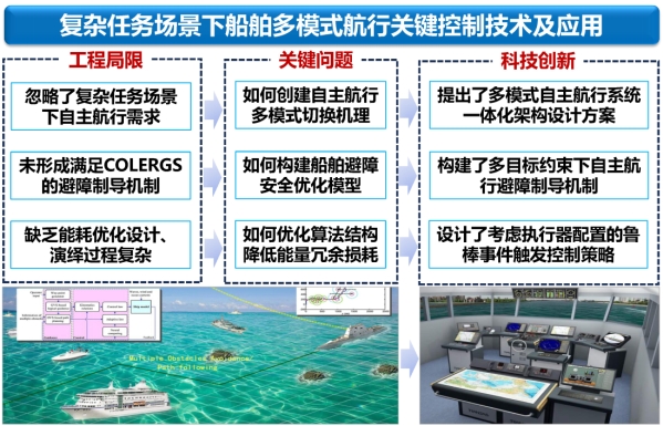 “复杂任务场景下船舶多模式航行关键控制技术及应用”成果面向海洋强国、交通强国等国家战略需求,在国家863计划课题、国家自然科学基金、博新计划等项目资助下,针对传统控制方案中船舶自主航行仅考虑单一跟踪控制功能、未形成满足COLERGS约束的船舶避障制导机制、缺乏系统能耗优化设计三大科技局限,提出了船舶多模式自主航行系统一体化架构设计方案,构建了多目标约束下船舶自主避障制导机制,设计了考虑执行器配置的船舶鲁棒事件触发控制方法,研制出了具有船舶自主航行多模式切换功能的自动舵原型样机,实现了对混合目标的自主避障、绿色智能航行等功能。项目相关成果得到领域内著名专家学者的高度评价,对船舶工程行业具有开创性引领和推动作用。