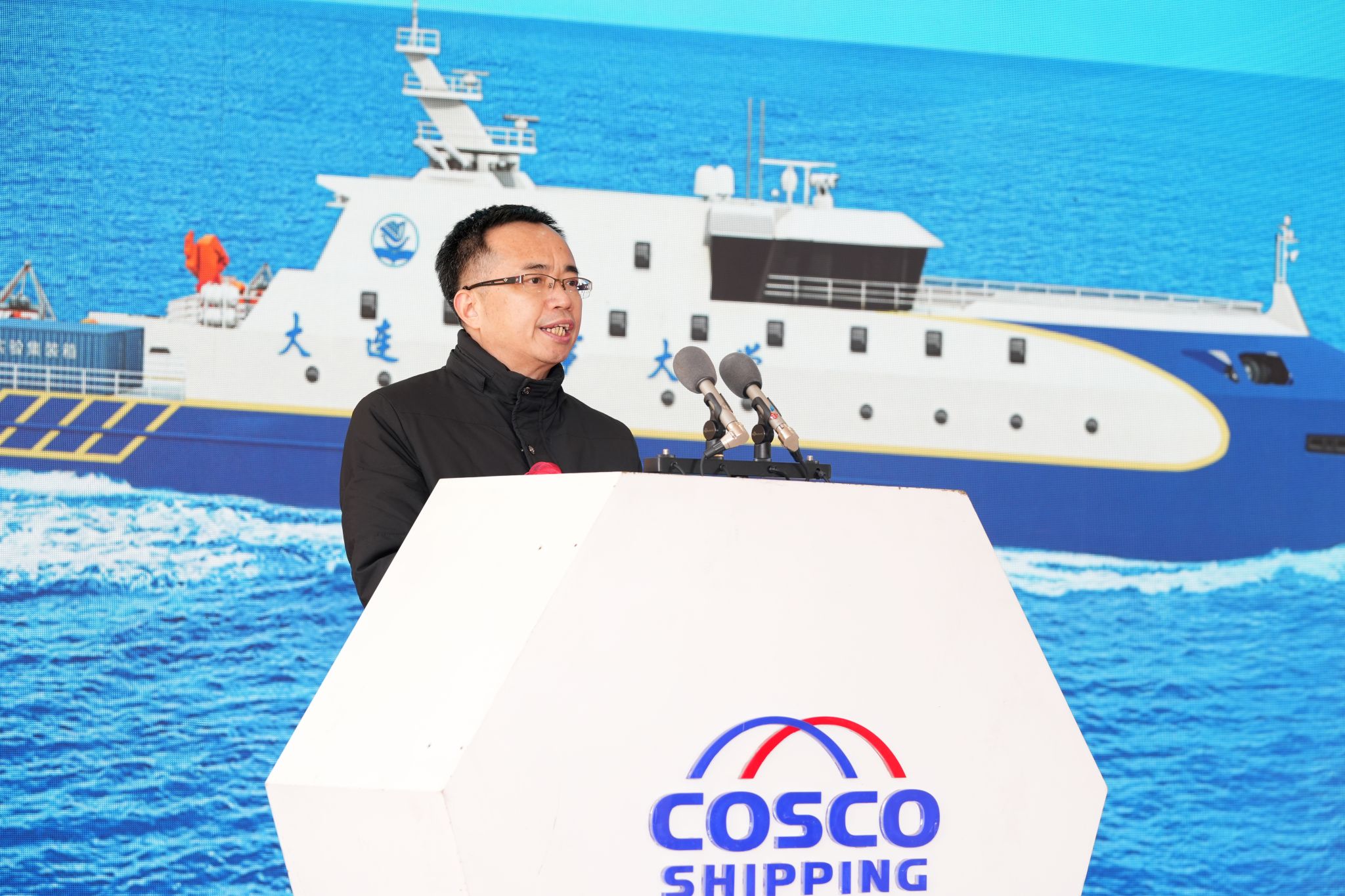 单红军在致辞中,向财政部大连监管局、辽宁海事局、中国船级社大连分社、中远海运重工有限公司、上海船舶设计研究院对“两用船”建造以及对学校事业发展的鼎力支持表示感谢。他从学校第一艘实习船“红专轮”回顾了60年来学校实习船从无到有,从有到优,从科技化到智能化的发展历程。他表示,“两用船”的建造在海大历史上有着承前启后,继往开来的特殊意义,承载着海大顺应智能船舶和智能航运发展趋势,奋力加快建设交通强国和海洋强国的光荣使命。未来,“两用船”投入使用后,学校将着力打造“两个平台”,一是与行业企业一道,深入推进科教融合、校企协同,把“两用船”打造成新一代智能船舶技术应用与综合试验的高端平台,以促进智能船舶开发运用和装备研制水平的提升,为我国智能船舶发展提供技术支撑;二是把“两用船”打造成智能航运高端人才培养平台,使学生能够直接感知最先进的智能船用设备、系统和技术,为探索创新未来航海人才的培养模式提供实践基础,努力引领智能时代航运人才培养模式创新。
