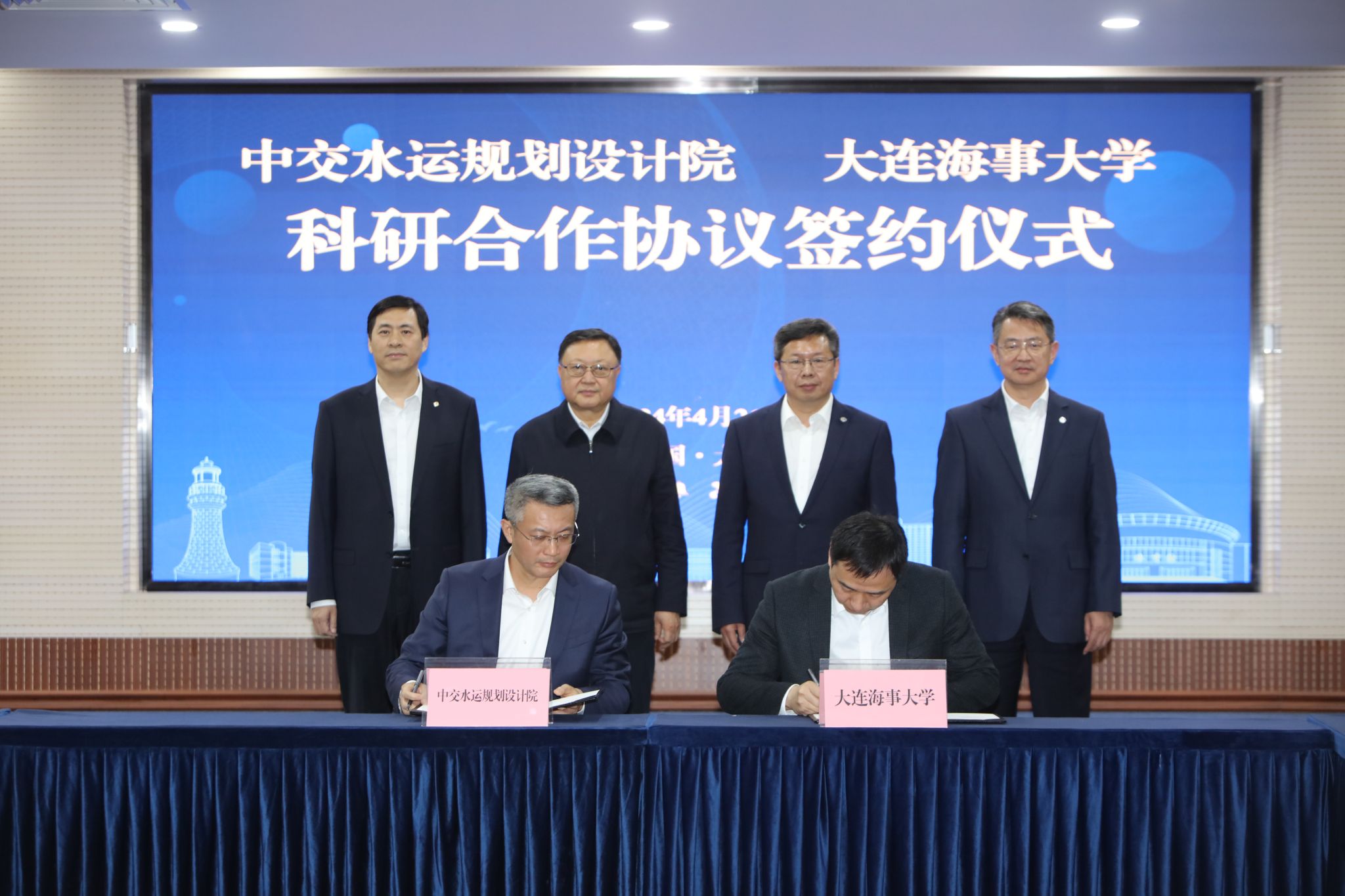 中交水运规划设计院有限公司总经理潘海涛与Beat365唯一官方网站航海学院院长章文俊围绕智慧航道方向签署科研合作协议。