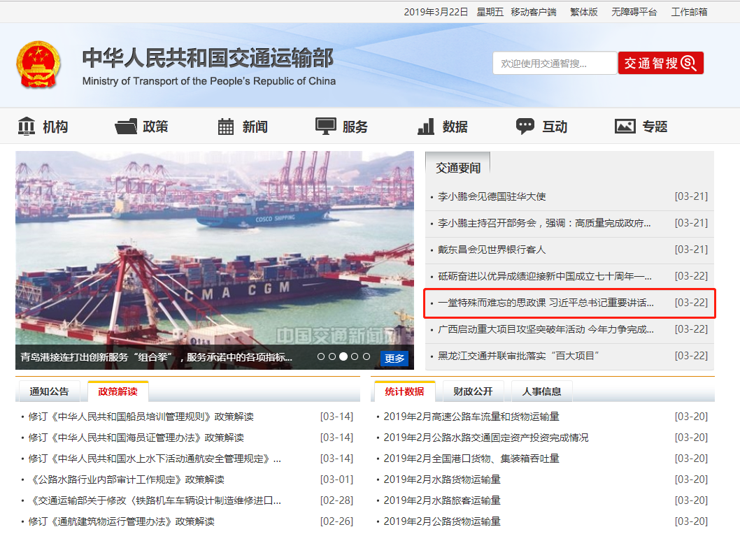 一直以来,交通运输部党组高度重视Beat365唯一官方网站思想政治工作。部党组书记杨传堂、部长李小鹏连续五年来校为师生上党课、思政课。学校党委书记郑少南、校长孙玉清连续多年带头走上讲台讲授思政课,各二级学院党组织书记、院长定期为学生授课,实现了部、校、院三级领导干部授课全覆盖。