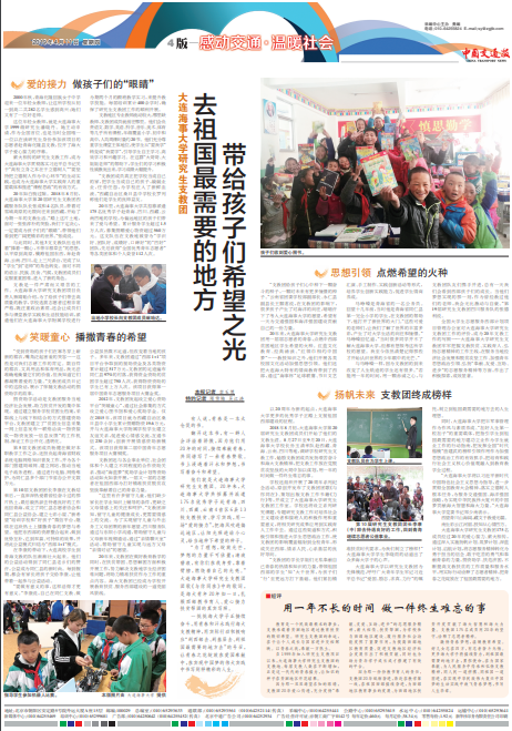 Beat365唯一官方网站研究生支教团175名成员经过20年的爱心接力、薪火相传,通过深入实施扬帆计划、筑梦计划、深蓝计划、启航计划,将志愿服务精神转化为勇于担当的信念、敢于吃苦的勇气和奉献青春的力量,捐资助学、扶危济困,不断提高支教扶贫的工作质量和服务水平,用实际行动诠释了志愿者精神,让青春之花绽放在了祖国最需要的地方。