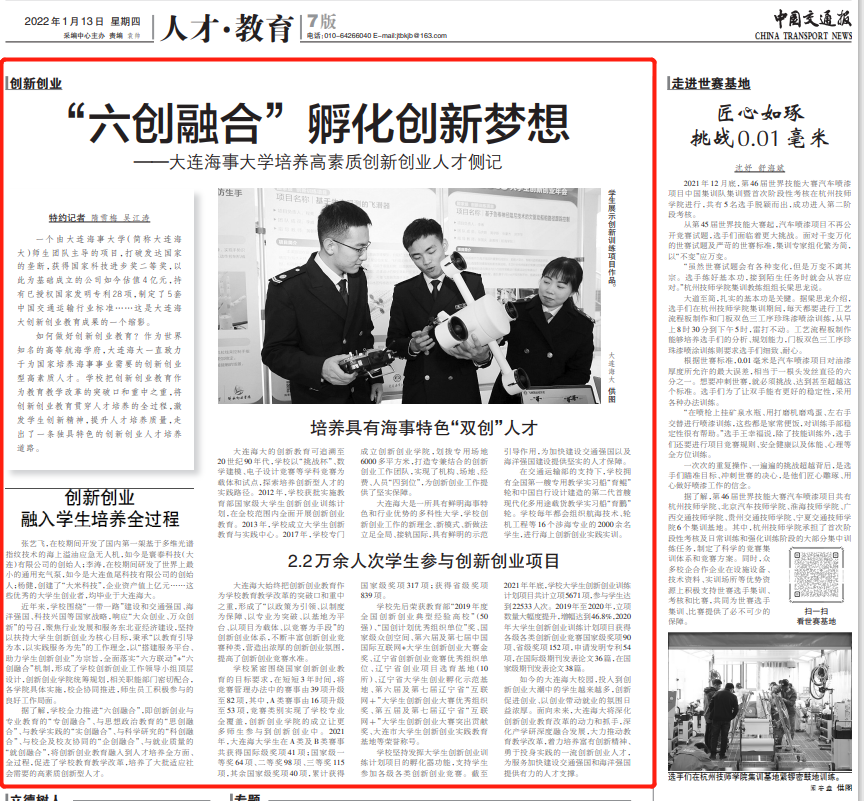 大连海大是一所具有鲜明海事特色和行业优势的多科性大学,学校创新创业工作的新理念、新模式、新做法立足全局、接轨国际,具有鲜明的示范引导作用,为加快建设交通强国以及海洋强国建设提供坚实的人才保障。