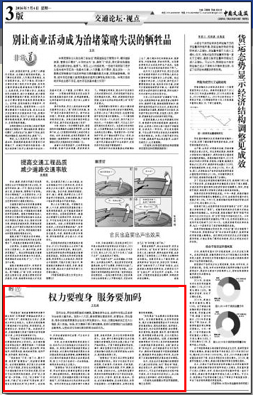 现代社会,界定政府职能的关键是,厘清政府与企业、政府与市场以及政府与社会的三重关系。党的十八大后,国务院提出简政放权、放管结合、优化服务,根本目的就是要激发社会活力和发展动力。对此,交通运输系统正在大力推进、深入实施。但是,权力瘦身不等于责任瘦身,政府行政管理部门应迅速适应新角色,从受动式作为转向更加积极主动的作为。