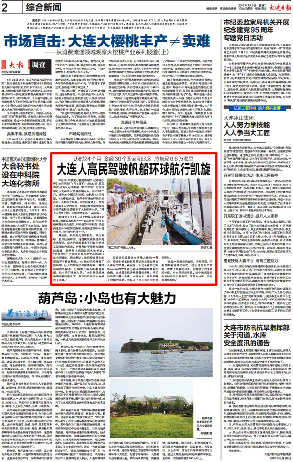 2014年7月1日,42岁的高民率领3名船员,驾驶蓝水帆船——“第二梦想”号从东港商务区码头出发,开始他的环球航行,最北到达北纬60度阿拉斯加,最南到达南纬55度合恩角,最长连续航行45天。