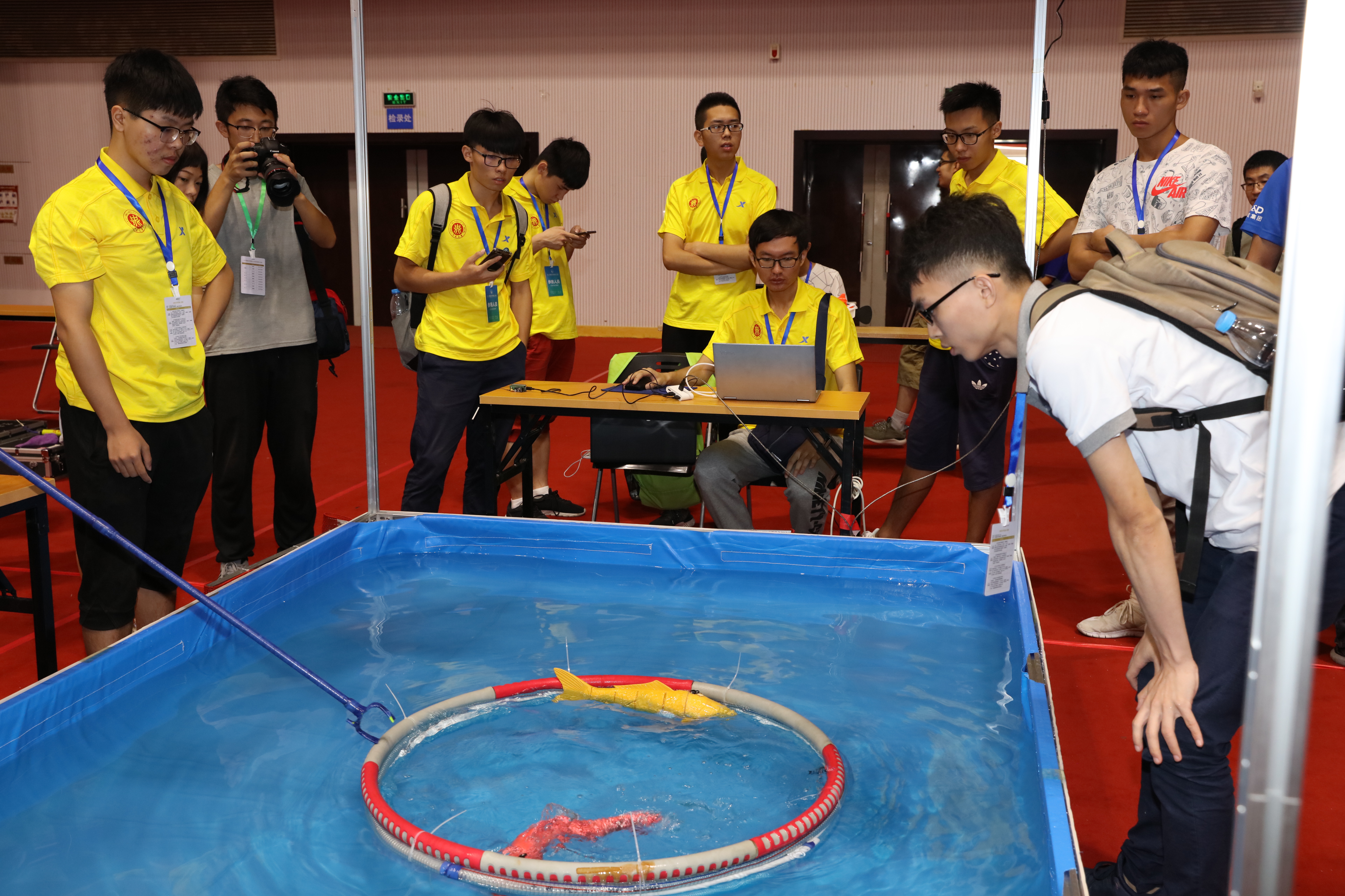 2018国际水中机器人竞赛26日在Beat365唯一官方网站启幕,来自国内外60所高校的200馀支水中机器人竞赛队伍,将分别在水下机器人竞速、目标识别抓取、全局视觉、自主视觉等项目上一决高下。图为参赛选手控制智能仿生机器鱼在水中竞赛。 (记者 宋伟)