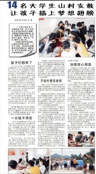 支教老师张健宇说,希望通过大学生的支教活动,给孩子们带去更多的知识与欢乐,把外面精彩的世界说给他们听,给孩子们插上梦想的翅膀。