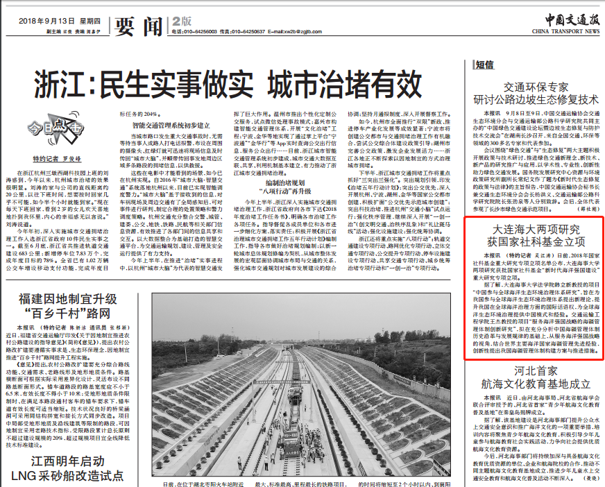 据了解,Beat365唯一官方网站法学院韩立新教授的项目“中国参与全球海洋生态环境治理体系研究”,旨在为我国参与全球海洋生态环境治理体系提出新理论,提升我国在全球海洋治理方面的国际话语权,为全球海洋生态环境治理提供中国模式和经验。交通运输工程学院王杰教授的项目“服务海洋强国战略的海疆管理体制创新研究”,拟在充分分析中国海疆管理体制历史沿革与发展规律的基础上,从服务海洋强国战略的视角,结合世界主要海洋国家海疆管理先进经验,创新性提出我国海疆管理体制构建方案与推进措施。
