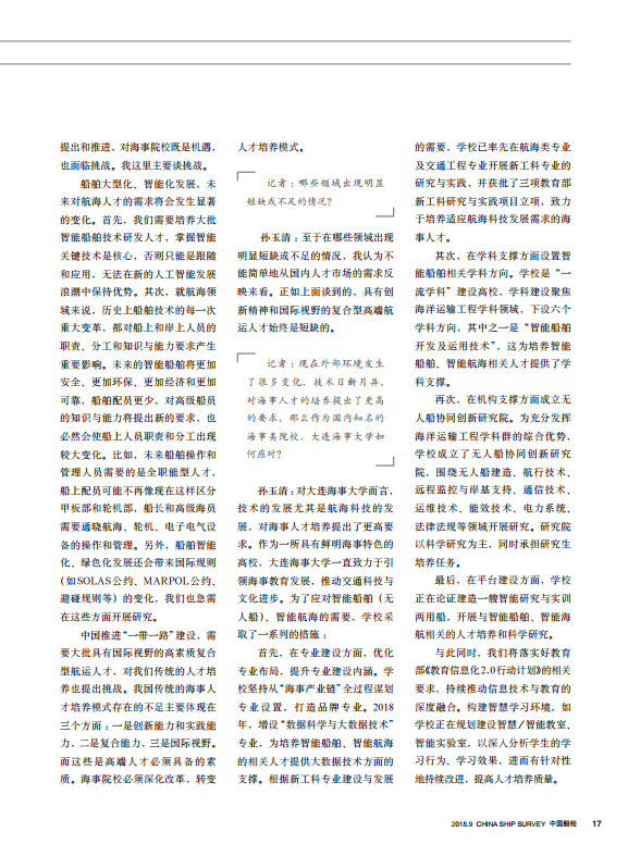 记者:随着船舶大型化、智能化发展,以及“一带一路”倡议的提出,对航运人才在数量和质量上提出了更高要求,我国当前的人才培养面临哪些挑战?