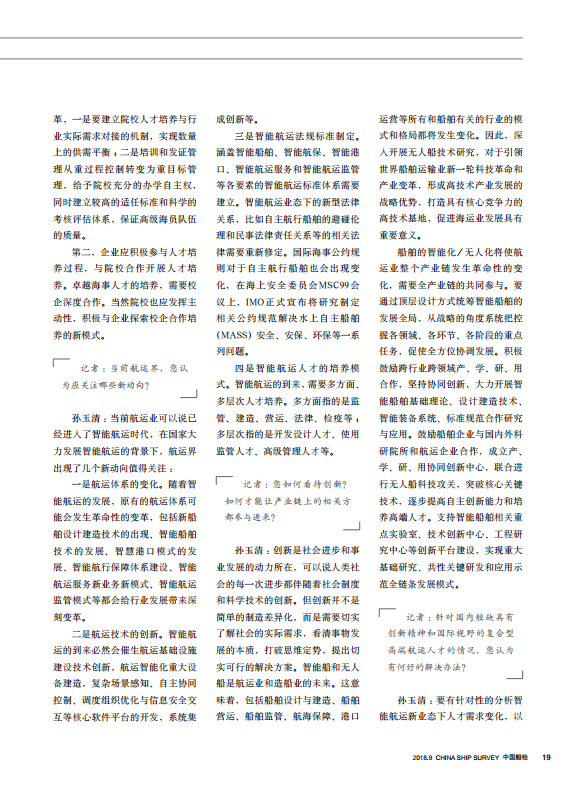 孙玉清:要有针对性的分析智能航运新业态下人才需求变化,以专业院校培养、国际联合培养、企业合作培养及人才再教育等方式加快发展智能航运核心人才培养。高校要适应智能航运发展趋势与需求,调整优化相关专业教育结构,加快智能航运新业态所需的多方面多层次人才培养。