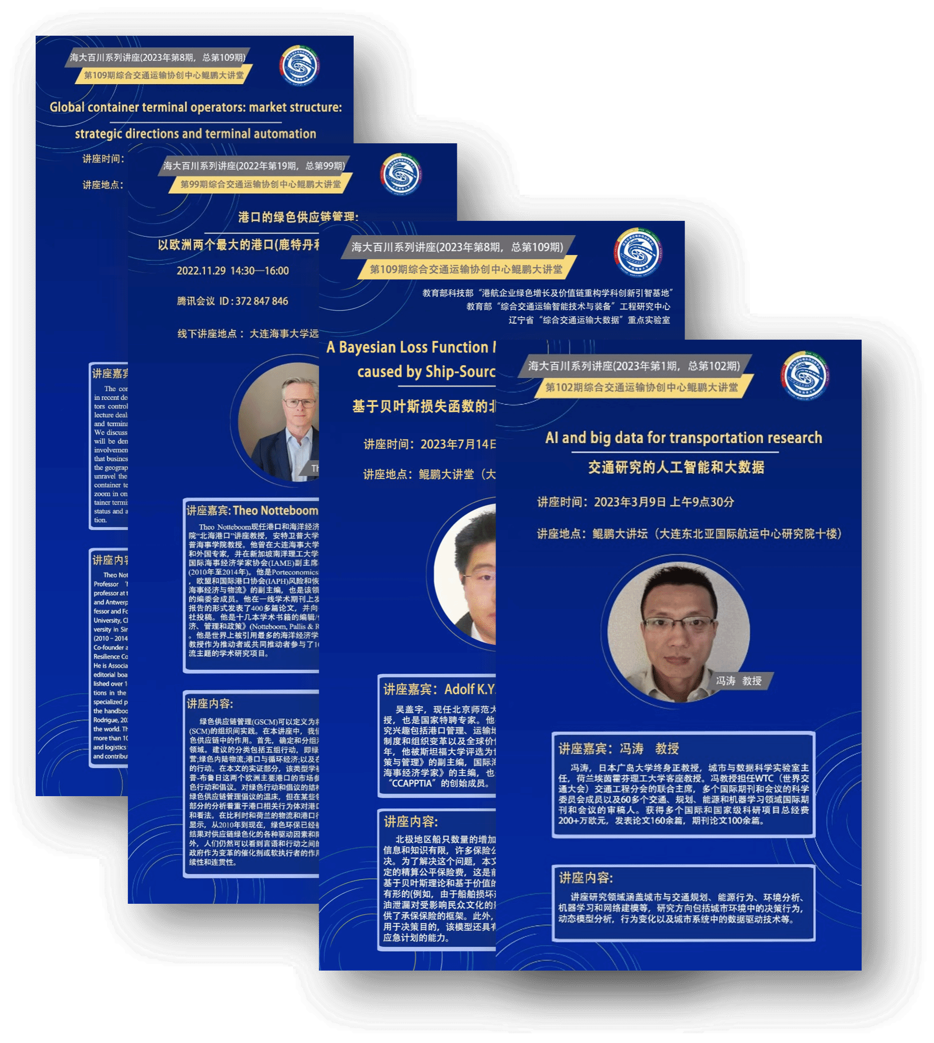 引智基地主任匡海波,管理学博士,大连东北亚国际航运中心研究院院长,Beat365唯一官方网站综合交通运输协同创新中心主任,“综合交通运输智能技术与装备”教育部工程研究中心主任,科技部重点研发计划首席科学家,Beat365唯一官方网站航运经济与管理教授/博士生导师。 教育部科学技术委员会管理学部委员与学风建设与科学传播专门委员会委员,交通运输部、教育部、科技部、国家自然科学基金委员会的资深评审专家,中国优选法统筹法与经济数学研究会、中国系统工程学会、中国物流学会等6个国家级重要学会的理事或常务理事,在全国交通运输行业有较大影响力。近年来,先后主持120余项各类科研项目,项目总金额1.5亿元(其中,科技部重点研发计划重点专项1项,国家自然科学基金重点项目1项,面上项目3项,其它项目110余项);发表高水平论文150篇,其中在FMS管理科学中文T1 级期刊上发表学术论文80余篇。教育部长江学者和创新团队发展计划“港口协同发展与绿色增长”负责人;辽宁省高校创新团队支持计划“港口低碳智能化及关键技术”负责人。主持科技部重点研发计划“综合交通运输与智能交通”重点专项“多式联运智能集成技术与装备开发 (2019YFB1600400)”,主持国家自然科学基金重点项目“绿色港口与航运网络运营管理优化研究(71831002)”。出版学术专著12部,主持撰写并发布《中国交通运输行业年度企业社会责任发展报告》与《中国综合交通运输体系年度发展报告》,这两个报告是中国交通运输行业智库标志性报告,备受海内外媒体关注。