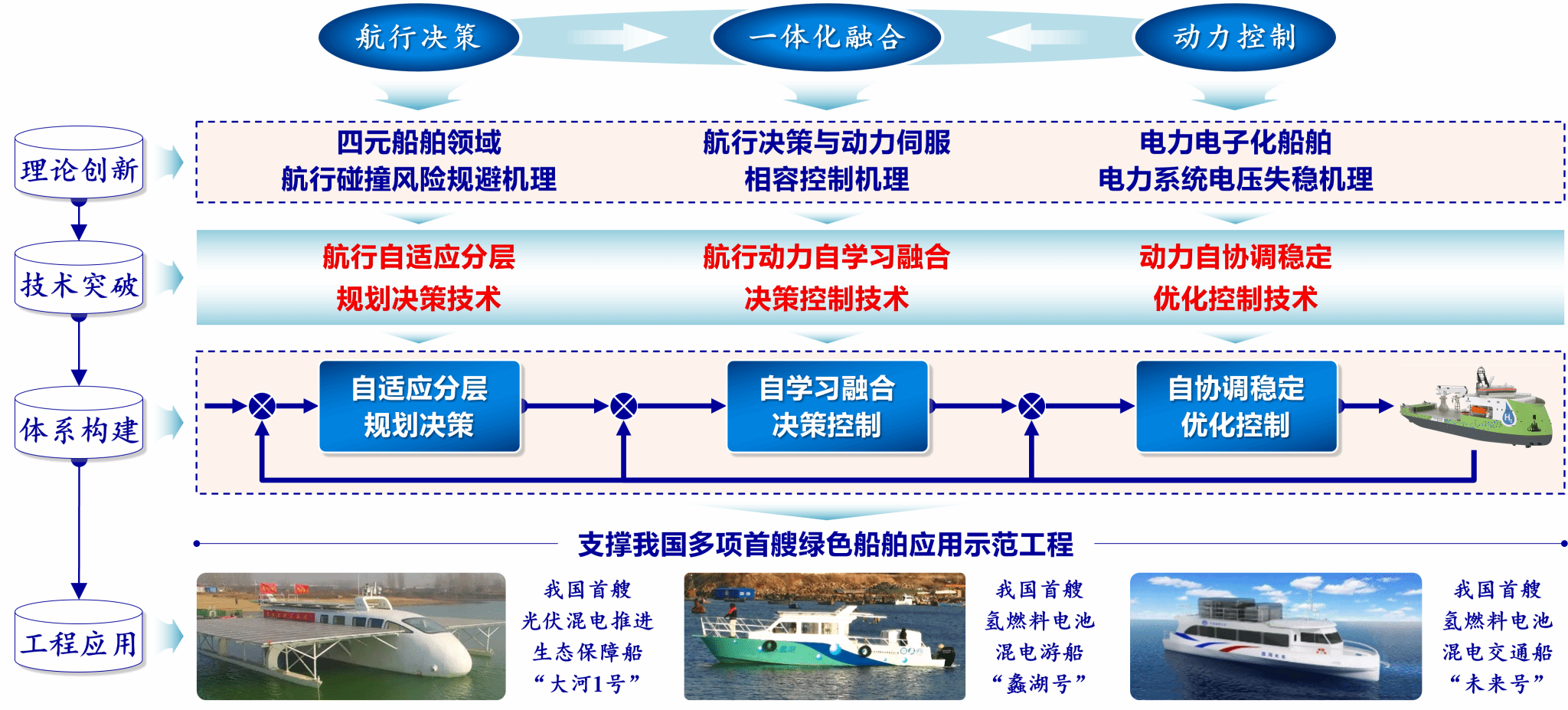 实验室以绿色智能船舶的“船-桨-机-电”综合动力系统为主要研究载体,以船舶自主航行整体性能最优为目标,面向“智能推进-自主航行”一体化复杂动力系统,聚焦于智能船舶的绿色混合动力控制及测试关键技术突破和核心装备研制,部署系统性应用基础理论研究和工程技术开发工作,设置五个研究方向。方向一:自主航行能效优化决策,研究内容包括多约束动态航线规划、航行状态优化决策、航行操纵指令优化;方向二:船舶运动操纵性匹配控制,研究内容包括最优航线智能跟踪控制、最优航线智能跟踪控制、非线性桨舵联合控制;方向三:航行性能自适应推进控制,研究内容包括推进动力能效优化控制、混合模式自适应推进控制、推进动力故障容错控制;方向四:绿色动力能量管理与控制,研究内容包括推进动力自适应能量供给决策、混合储能模式优化与切换控制、推进动力冲击负荷功率控制;方向五:绿色动力控制系统孪生与测试,研究内容包括智能船舶混合动力控制系统设计、航行推进联合控制系统数字孪生、绿色动力系统虚实融合试验与测试。