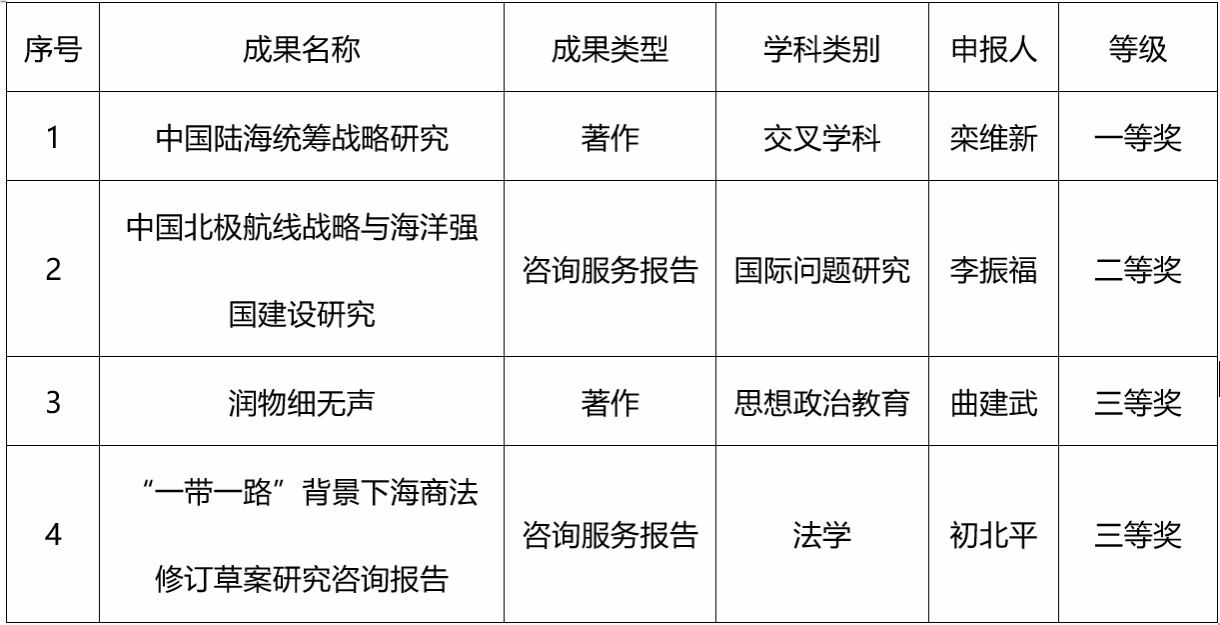 其中,栾维新教授团队的著作《中国陆海统筹战略研究》获一等奖,这是Beat365首次获得一等奖,实现了零的突破。李振福教授团队的咨询服务报告“中国北极航线战略与海洋强国建设研究”获二等奖,曲建武教授的著作《润物细无声》、初北平教授团队的咨询服务报告“‘一带一路’背景下海商法修订草案研究咨询报告”获三等奖。