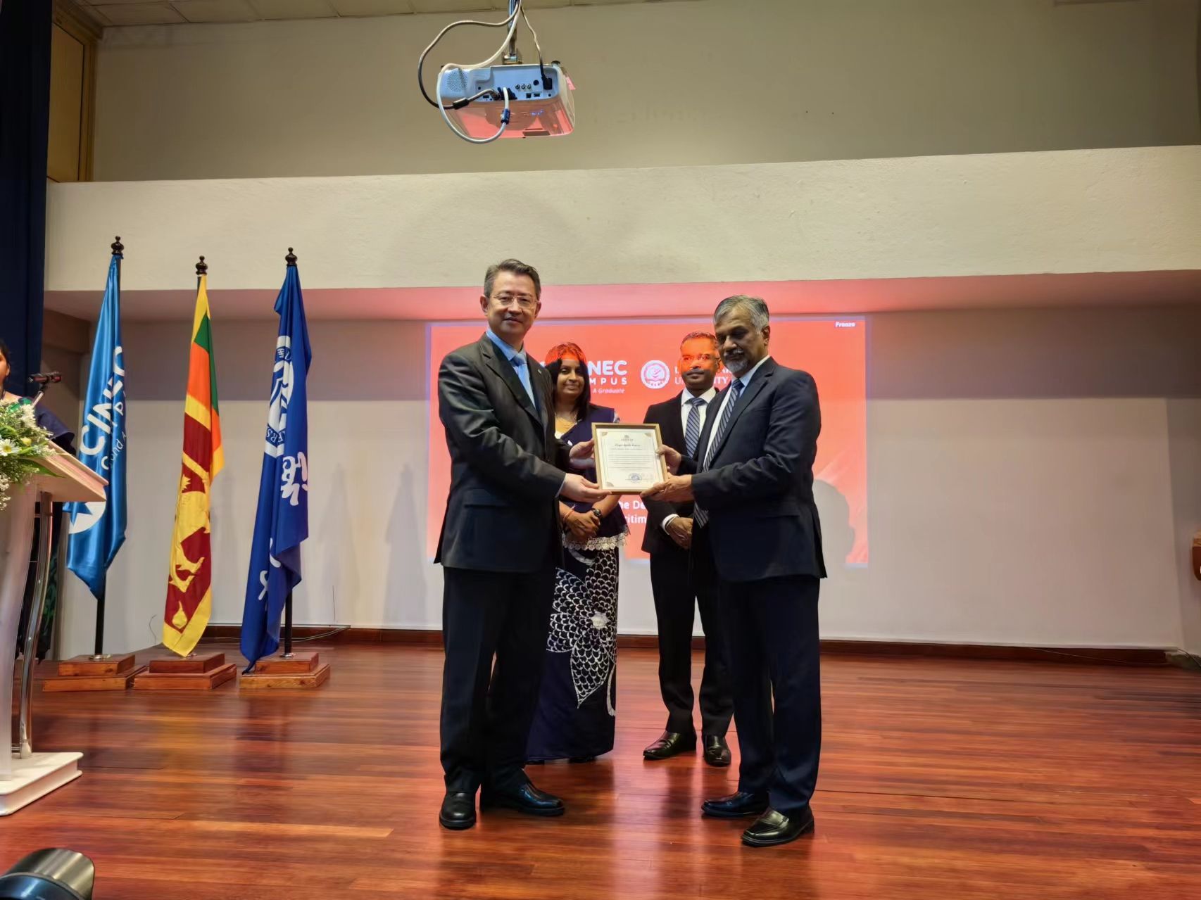 单红军向Ajith Peiris校长颁发了服务行业50周年感谢状、向斯里兰卡校区项目执行负责人Lalith Edirisinghe颁发了讲座教授聘任证书。