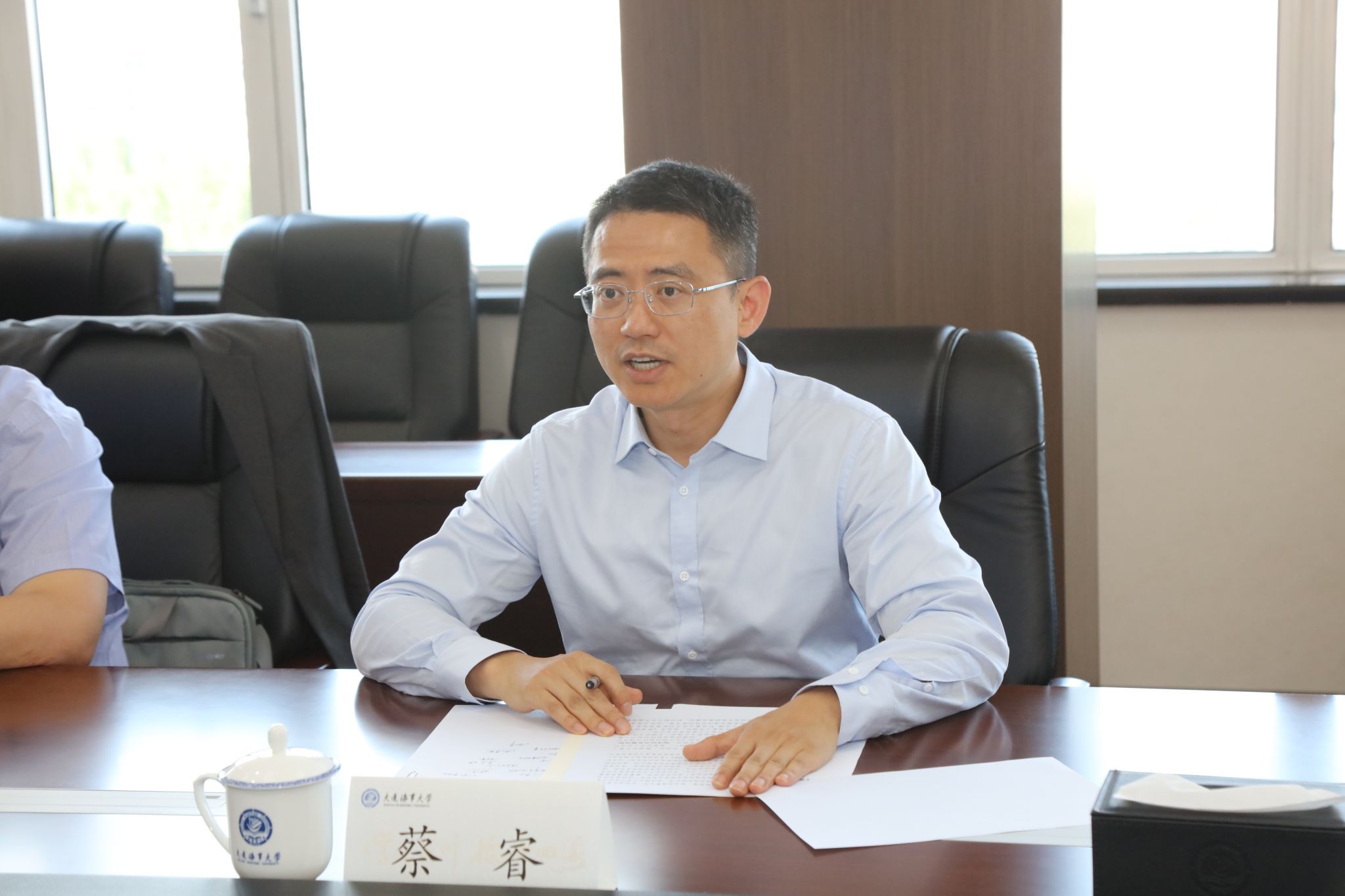 蔡睿对学校在海洋运输科技领域所取得的成绩表示肯定,对学校的港航领域鲜明的发展特色给予赞赏。他表示,辽宁在海洋经济发展大有可为,省科技厅将通过项目统筹布局,建立创新联合体等措施,持续加强辽宁在海洋经济领域的科技创新能力。希望学校在国家重大项目中充分发挥辽宁作用,将更多重大项目取得的成果在辽宁落地转化,充分发挥学校在促进辽宁沿海经济带高质量发展和振兴辽宁海洋经济建设的优势作用。