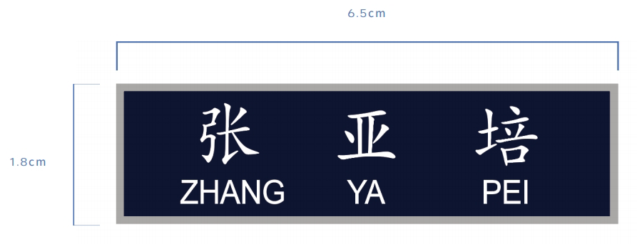 材质:三层符合结构,面层为涤纶低弹丝提花机织片,底层为锦丝搭扣带(勾面),两层之间通过热熔胶片机粘合,然后包边缝合。正面图案由姓名和拼音组成(姓名和拼音上下分布;汉字字体:华文楷体,拼音字体:Arial)底色为藏青色,姓名颜色为金黄色,锁边线为藏青色。