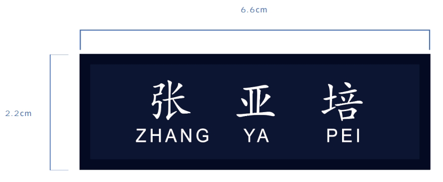 材质:姓名牌正面图案由姓名和拼音组成(汉字字体:华文楷体,拼音字体:Arial),背面双螺丝扣距离约4.5cm。