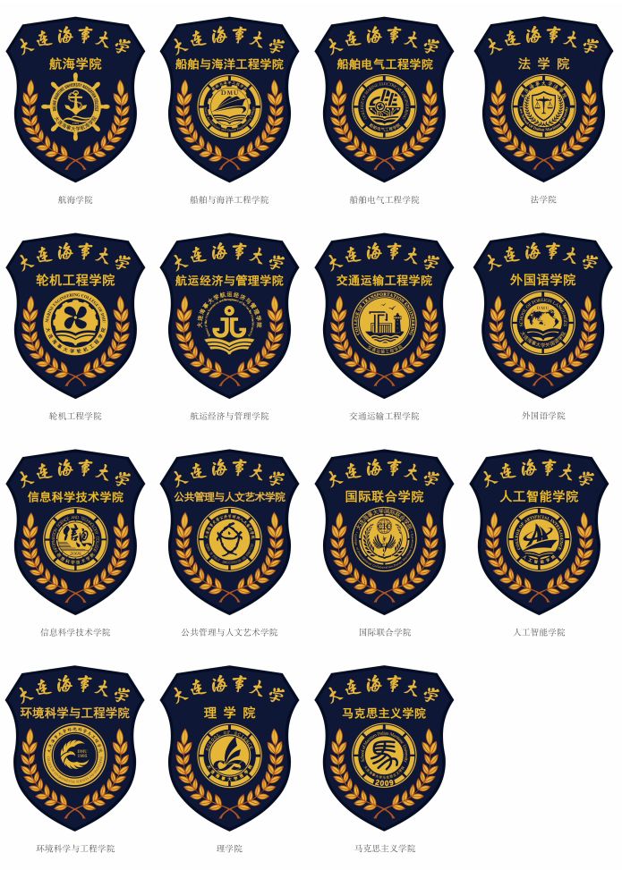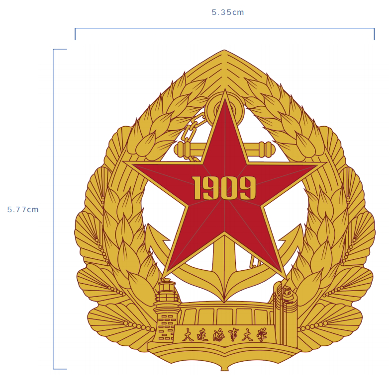 寓意:承载56颗麦穗的海大巨轮,书页/海浪造型和藏蓝色底托,象征海大纳56个民族青年才俊在知识的海洋中探索、领航。中心处船锚和五角星造型,象征着海大坚定不移践行为党育人、为国育才的初心,五星中间的1909代表学校创办年份,增添了帽徽的历史厚重感(五星中间的DMU代表学校英文名称,丰富了帽徽中英文元素)。学校标志性建筑融入帽徽,代表着海大学子的荣耀和对学校的归属。外围由松枝环绕,象征海大事业平稳持久、蒸蒸日上。