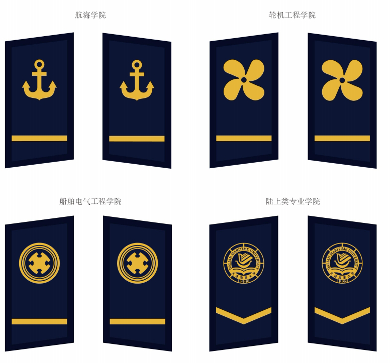 航海类专业本科生肩章中的锚、桨、电机有着鲜明的专业特色,寓示学生对专业的认同感和荣誉感;横杠的数量及粗细代表了不同的年级及是否担任学生干部职务。非航海类专业学生肩章中的校徽标志,寓示学生对海大的归属感和自豪感;本科生折杠的数量代表不同的年级
