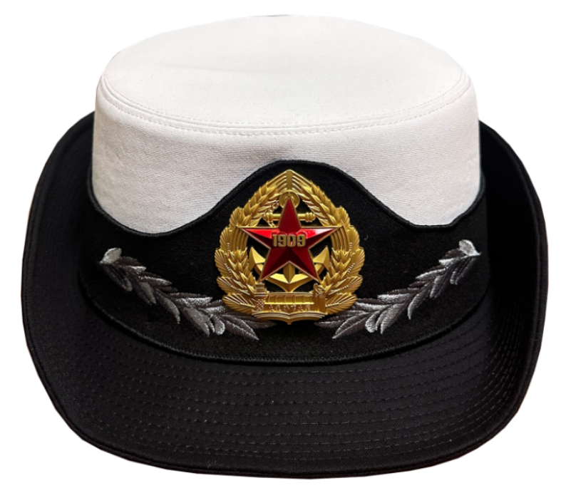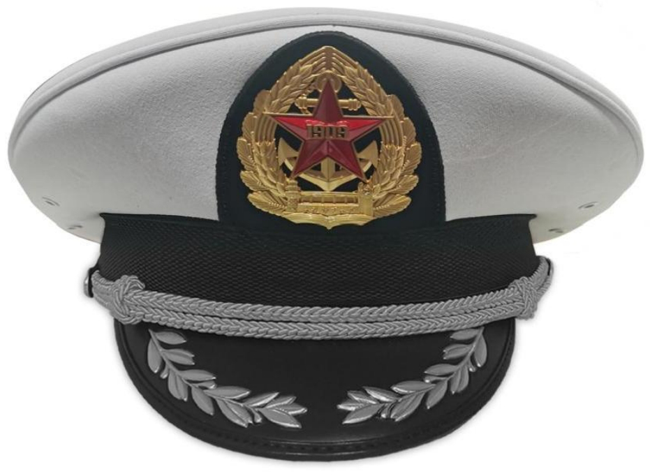 帽墙材质:颜色藏青色哗叽面料,涤75%粘胶23%氨纶2% 克重约230克/平方米。顶部前,后略翘的马鞍式大檐帽,帽顶下有四片帽瓦,帽顶牙线为主料白色,塑料前瓦托,前瓦正中有一个帽徽气眼,帽墙上有黑色丝带和银灰色帽饰带,帽墙上黑色织带与帽徽位置配帽徽形底托毛毡,黑色帽檐,帽檐上有两片银灰色橄榄枝,配涤纶松紧带防风带。