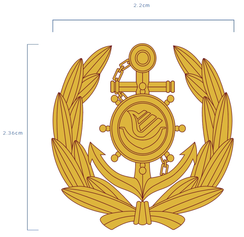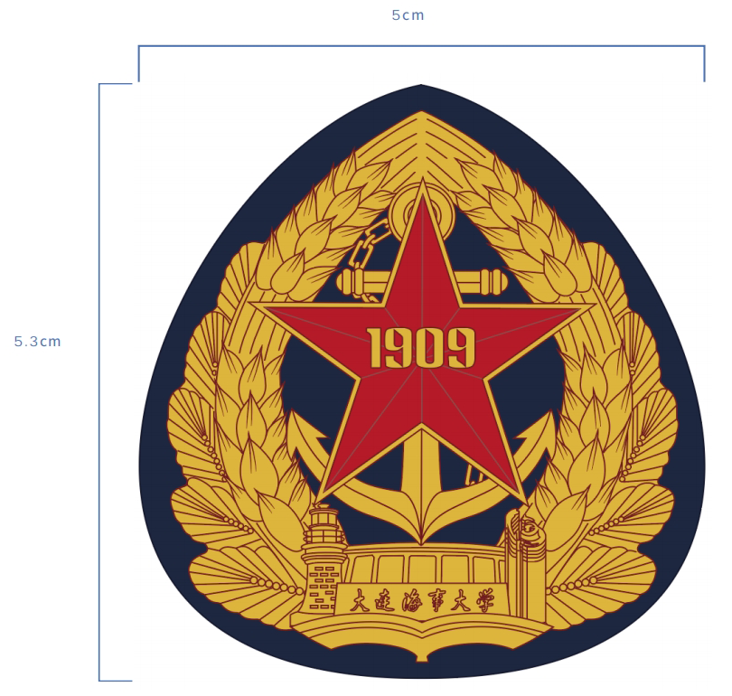 整体造型为船型,红、黄色调搭配,金属帽徽,主体融入五角星、船锚、学校标志性建筑元素,中间空隙处镂空,船体上附56颗立体麦穗造型,整个船体外围由松枝环绕,下部由展开的书页(起伏的海浪)托起。帽托为藏蓝色毛毡。